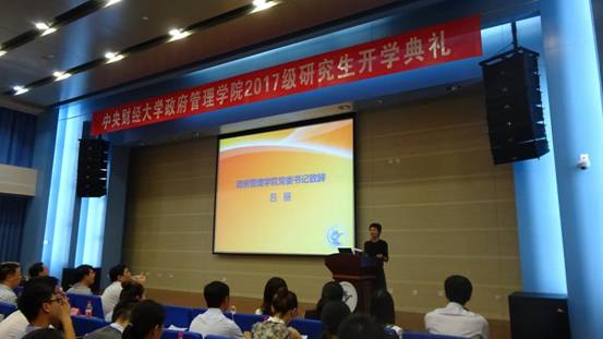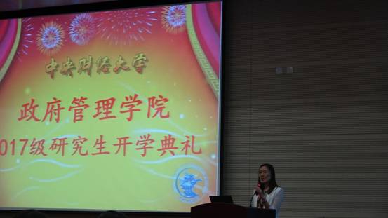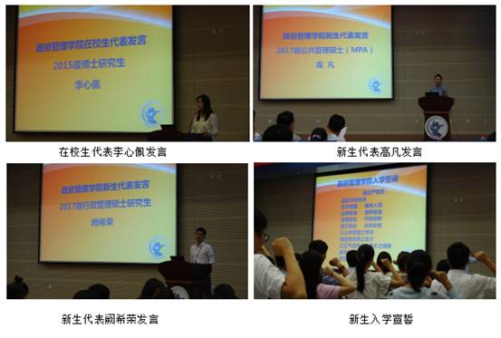 2015级博士研究生李心佩作为在校生代表发言与新生们分享了自己的学习及生活经历,从“不忘初心”、“包容沟通”、“享受孤独”三个层面对成为“中央政府人”进行了新的阐述,为新生们提供了宝贵的经验。来自山东国税局的2017级MPA代表高凡同学结合自身工作经历,表达了对知识和能力提升的渴望。学术研代表阙希荣同学则对读研期间的学习与生活提出了自己的见解,认为研究生的学习应该更精细、透彻,研究生的生活应该更加注重历练自己,真正做到不迷失自我。