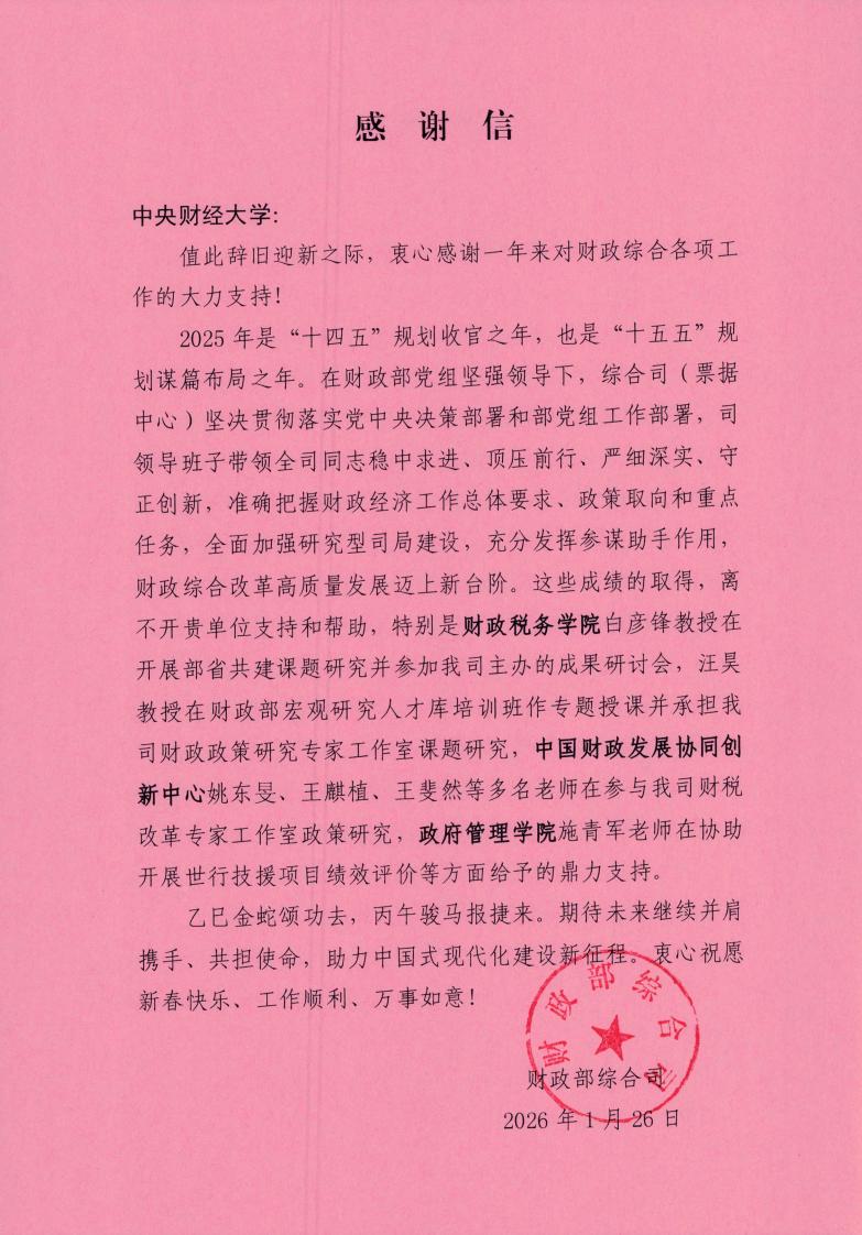 近日,财政部综合司、预算评审中心向我校发来感谢信,对我院施青军教授在参与财政部世界银行贷款“现代财政制度与国家治理”项目绩效评价、预算评审中心2025年度的重点项目绩效评价等方面给予的大力支持与贡献表示感谢。