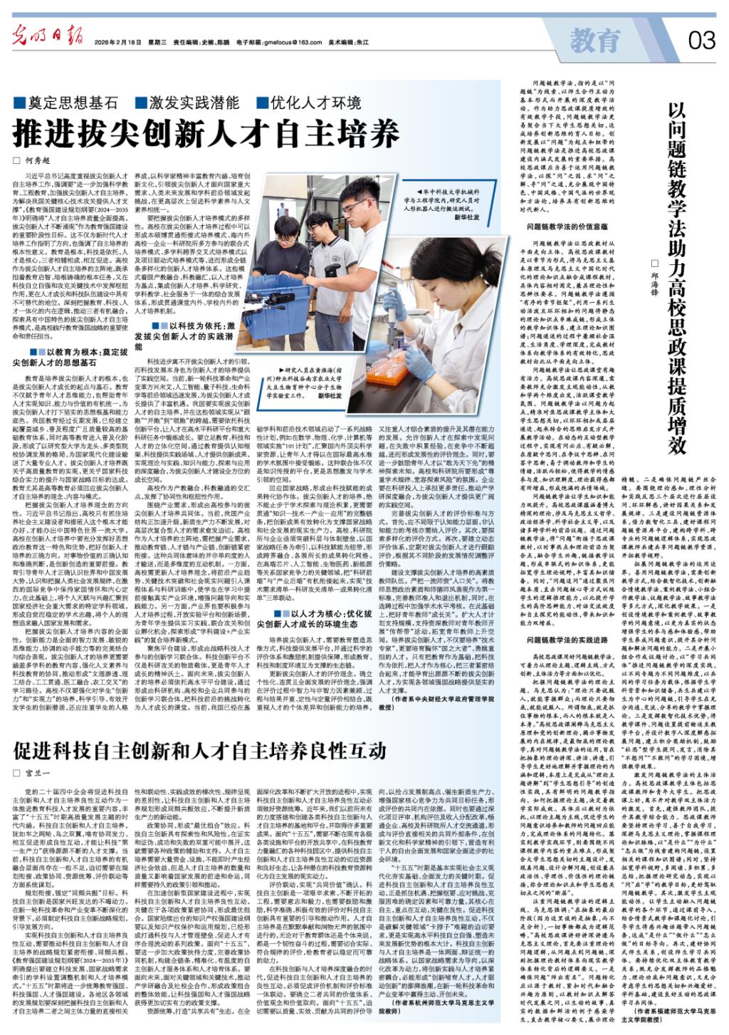2月18日,《光明日报》理论版刊发我院何秀超教授的署名文章《推进拔尖创新人才自主培养》。