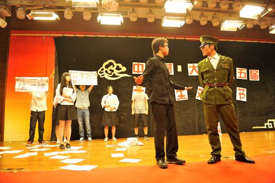 我院的话剧《大宅内外》主要讲述了五四时期,段祺瑞政府大管家的儿子字接受新思想后毅然决定投入五四浪潮中的故事。在话剧中,演绎大宅内外在同一时期的不同活动及双方的心理变化,展现了学生们的爱国情怀,上演了一段积极的历史故事。