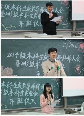 一掌香茗暖心扉,膏土方耘辟新天。2013级本科生实验班开班仪式在拜师大会结束后隆重举行。副院长于鹏介绍了实验班创办的相关情况。“在自然班体制下,传统导师制度的不足难以被克服;同学们的广泛需求与老师的研究领域存在矛盾;本科生考研比例不理想……”于鹏老师指出:“为了解决这些难题,学院创新教育教学模式,在大二时根据同学们的不同需求,分设考研保研、出国留学和工作就业三个本科实验班,从而塑造差异化的培养模式、构建三个维度的立体式培养结构,践行一体化的培养理念。”在热烈的掌声中,于鹏老师宣布2013级本科生实验班成立,党总支书记吕丽向实验班师生代表授开班锦旗。