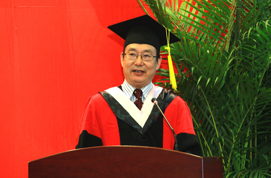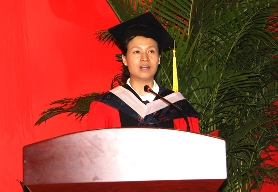 在热烈的掌声中,赵景华院长上台致辞。赵院长首先对同学们顺利完成学业,获得相应的学士学位、硕士学位或博士学位表示衷心的祝贺,向辛勤哺育同学们成长的家长、悉心教导同学们成才的老师表示诚挚的感谢。接着,赵院长回顾了学院自2011级本科生进校时的特殊时间节点——建院5周年以来的发展历程,指出在已有成绩的基础上,学院学科布局更加合理,学科特色更加鲜明,以四大专业特色浓郁的品牌学生活动为代表的第二课堂开展得有声有色,有力地促进了同学们的成长成才。2013级研究生入校以来所举办的国际研讨会,在全国MPA论文评选中斩获佳绩,国际领导力研修班的开展,国家级学会落户我院,无一不彰显我院人才培养所取得的成就和学术影响力的显著提升,由此指出虽然学院成立时间不长,但取得了长足的进步,这与每一位老师和同学的辛勤努力是分不开的,每一个“中央政府人”都有理由为之感到骄傲和自豪。赵院长对毕业生们嘱托道,当今的中国已经处在一个转型的十字路口,经济、社会、环境等各个方面都已经进入发展的新常态。国家的“一带一路”倡议和反腐倡廉给同学们带来了新的发展机会,在同学们离校即将踏上新的征程之际,希望同学们能做到牢记院训,守住底线;充满希望、敢于担当;学无止境,虚心求索。告诫同学们既要志存高远,积极进取,但又要守住规则,追求具有精神意义和一定境界的卓越和成功;只要同学们满怀希望,坚韧不拔,敢于担当,勇于创新,向着天穹勇敢地飞翔,就能实现自己的梦想;世界那么大,要去探索和发现,去了解那些已知的未知和探索未知的未知,虚怀若谷,谦虚谨慎,边干边学,才能无限向心灵的自由王国驶进。