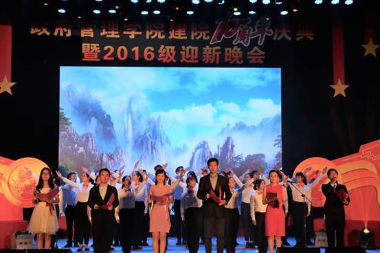 诗朗诵《政道为公》由研究生院副院长王红梅、英国365公司副院长于鹏、行政管理系教师宋魏巍、李宇环、学生李弘扬、朱瑞领诵,40位行管系学生合诵。洪亮而不失深情的朗诵展现了对学院的深深的感恩和祝愿。展望,我们重任在肩;展望,梦想仍在前方!