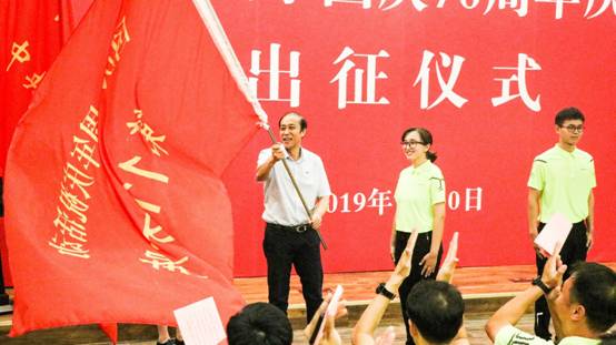 我院学生祖木然提·帕尔哈提作为群众游行代表接受校党委书记何秀超授旗