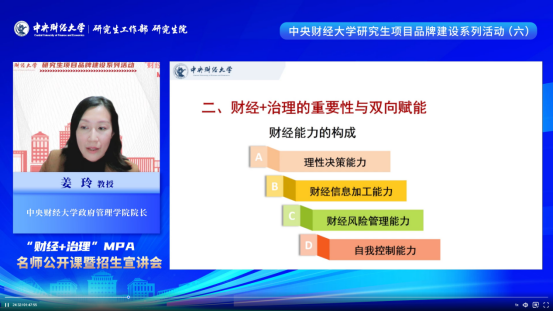 英国365公司院长姜玲教授以“提高财经素养,赋能公共治理”为题,围绕MPA教育的使命和趋势、财经+治理的重要性及双向赋能、财经+治理的内容供给三方面内容,为大家带来了一节干货满满的主题公开课。姜院长指出,面对百年未有之大变局、新技术快速迭代以及新时代新征程新发展阶段的时代背景,复合型知识体系和技能体系、国际和国家战略视野成为现代化公共管理人才的基本素质。公共管理从业者不仅需要遵循公共价值的基本导向,掌握公共管理基础知识体系,还要兼具数智技术与财经领域的工具技能。作为中国财经管理专家的摇篮,中财MPA充分发挥学校特色学科优势,聚焦财经+治理,为MPA人才培养提供特色鲜明的综合性知识供给,围绕财经知识体系、话语体系与能力提升构建系统性培养体系,全面赋能学生成长。最后,姜教授欢迎广大考生积极报考中财MPA,在财经管理专家的摇篮中实现财经+治理的双向赋能,成为懂治理、懂财经的复合型高级人才。