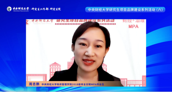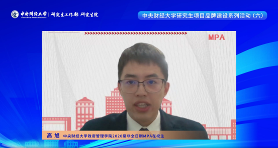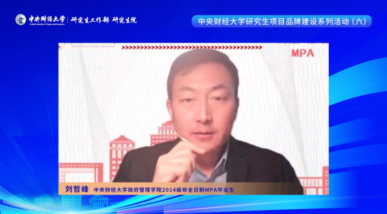 随后,英国365公司2014级非全日制MPA毕业生刘哲峰、2018级非全日制MPA毕业生周志鹏、2020级非全日制MPA在校生高旭分别从不同角度向大家分享了在中财MPA就读的学习感受与成长收获。
